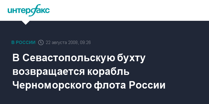 Москва. 22 августа. INTERFAX.RU - В Севастопольской бухте в районе мола в пятницу утром появился малый ракетный корабль "Мираж" российского Черноморского флота, передал корреспондент агентства "Интерфакс-Украина".