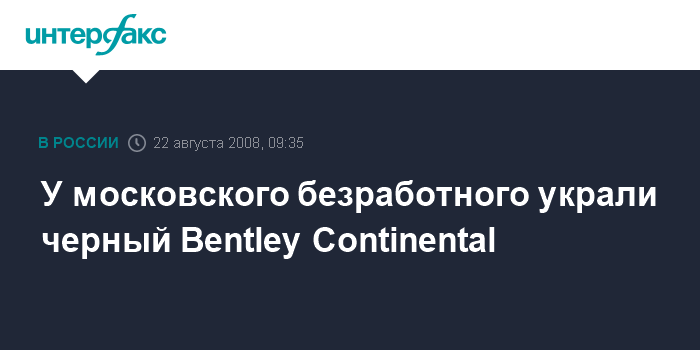 Москва. 22 августа. INTERFAX.RU - В Центральном округе столице неизвестные совершили угон автомобиля Bentley Continental, сообщил "Интерфаксу" источник в правоохранительных органах. "В четверг в милицию обратился 37-летний неработающий житель Москвы. Мужчина заявил, что неизвестные на ул. Зоологическая похитили его автомобиль Bentley Continental черного цвета, 2004 г. выпуска, стоимостью 4 млн 100 тысяч рублей", - отметил собеседник агентства.
