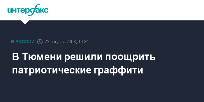 Москва. 22 августа. INTERFAX.RU - В Тюмени в пятницу пройдет фестиваль граффити, объявленный городскими властями. Как сообщили агентству "Интерфакс" в управе Калининского округа, всем желающим выдадут баллончики с краской и предложат расписать гаражи. Тематика рисунков патриотическая - граффити на тему государственного флага России.