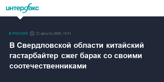Москва. 22 августа. INTERFAX.RU - В Свердловской области гражданин Китая совершил поджог барака, в котором спали 12 его соотечественников. В результате погибла одна женщина, есть пострадавшие.