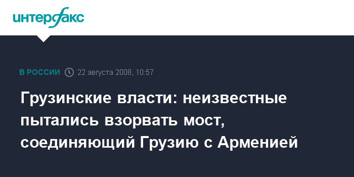 Москва. 22 августа. INTERFAX.RU - В Марнеульском районе Грузии неизвестными лицами была предпринята попытка взорвать железнодорожный мост, который связывает страну с соседней Арменией, заявили региональные власти.