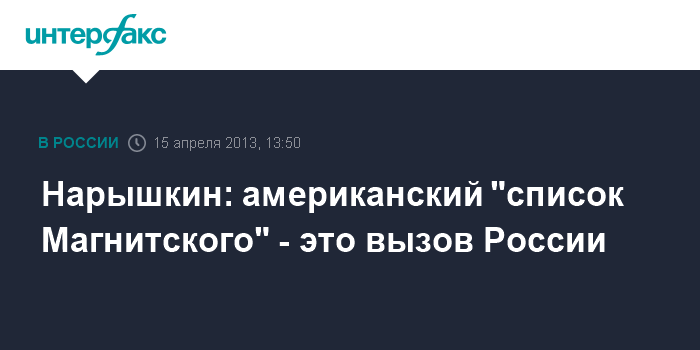 Москва. 15 апреля. INTERFAX.RU - Председатель Госдумы Сергей Нарышкин назвал "список Магнитского", обнародованный в США, противоправным документом и вызовом России.