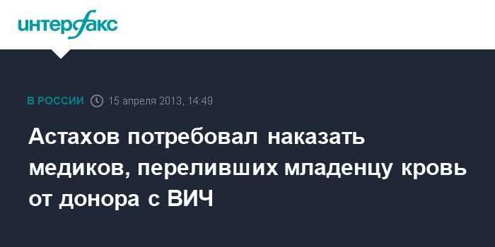 Санкт-Петербург. 15 апреля. INTERFAX.RU - Уполномоченный по правам ребенка при президенте РФ Павел Астахов требует найти и строго наказать виновных врачей, из-за безалаберности которых полуторагодовалому младенцу в больнице Петербурга перелили ВИЧ-инфицированную кровь.