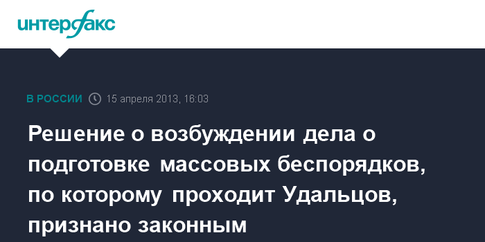 Москва. 15 апреля. INTERFAX.RU - Мосгорсуд признал законным решение о возбуждении дела против координатора "Левого фронта" Сергея Удальцова и двух других активистов, которых привлекли к ответственности по обвинению в подготовке массовых беспорядков.