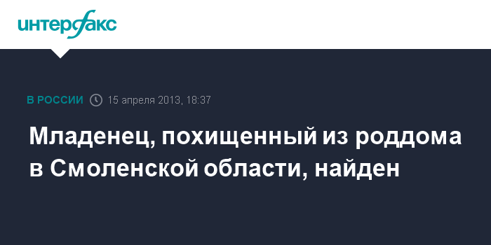 Москва. 15 апреля. INTERFAX.RU - Новорожденная девочка, похищенная из роддома в Смоленской области, обнаружена, ее жизни ничто не угрожает, сообщили "Интерфаксу" в пресс-службе СКР.