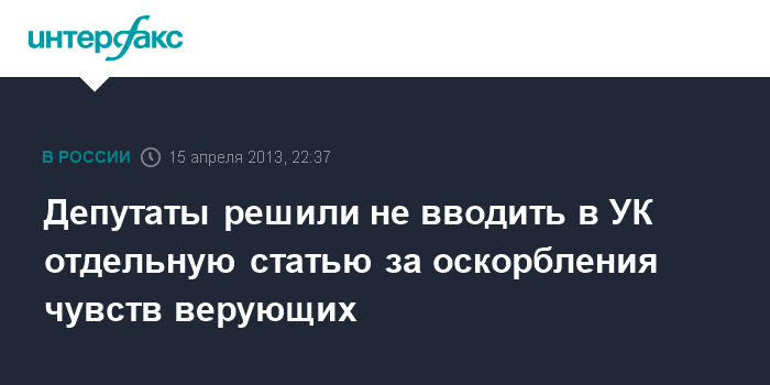 Москва 15 апреля. INTERFAX.RU – Депутаты отказались вводить в Уголовный кодекс статью, предусматривающую наказание за оскорбление религиозных чувств верующих, сообщил глава комитета по делам общественных объединений и религиозных организаций Ярослав Нилов. "Понимая и разделяя опасения критиков законопроекта, мы решили отказаться от введения новой статьи в Уголовный кодекс", — пояснил он.