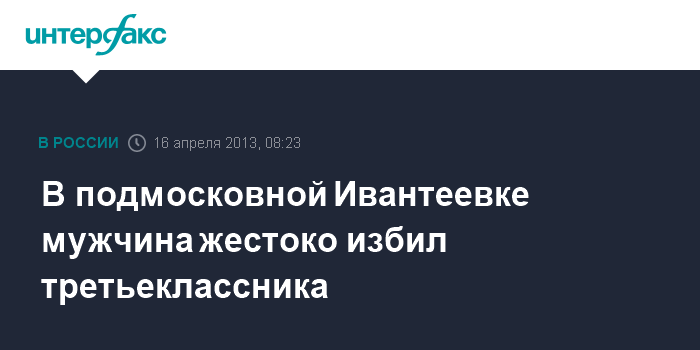 Москва. 16 апреля. INTERFAX.RU - Ученик третьего класса попал в больницу после жестокого избиения 26-летним молодым человеком, сообщили "Интерфаксу" в пресс-центре МВД России во вторник.