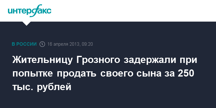 Пятигорск. 16 апреля. INTERFAX.RU - Женщина, пытавшаяся продать своего ребенка, задержана в Грозном, сообщил "Интерфаксу" во вторник источник в правоохранительных органах.