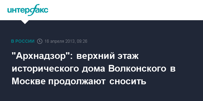 Москва. 16 апреля. INTERFAX.RU - Снос верхнего этажа дома князя Волконского на улице Воздвиженка в Москве возобновлен, сообщил координатор общественного движения "Архнадзор" Юрий Егоров.