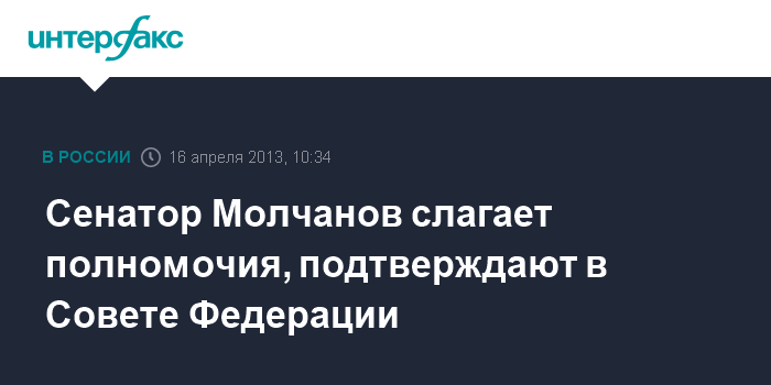 11 апреля о подаче Молчановым заявления о досрочном сложении полномочий члена верхней палаты "Интерфаксу" сообщили источники в Совете Федерации.