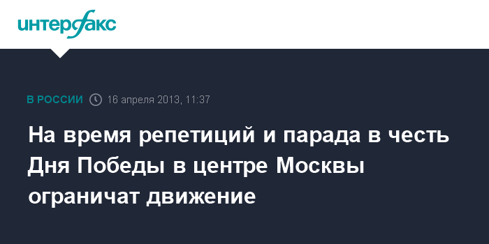 Москва. 16 апреля. INTERFAX.RU - Движение транспорта на ряде улиц в центре Москвы будет ограничено в связи с проведением репетиций и военного парада в честь Дня Победы, сообщает официальный портал мэра и правительства столицы со ссылкой на ГУП "Мосгортранс".
