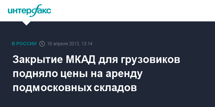 Москва. 16 апреля. INTERFAX.RU - В результате закрытия МКАД для проезда большегрузного транспорта ставки аренды на складские помещения в 10-километровом радиусе стали на 10-12% выше среднерыночных, свидетельствует исследование международной консалтинговой компании Knight Frank.