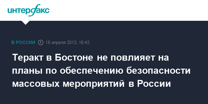 Москва. 16 апреля. INTERFAX.RU - Российские правоохранительные органы будут осуществлять контроль за безопасностью на массовых мероприятиях в плановом режиме, дополнительных мер в связи с терактом в Бостоне (США) вводить не планируется.