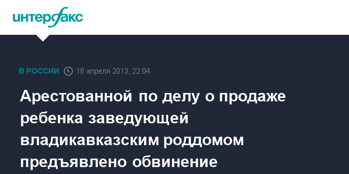 Владикавказ. 16 апреля. INTERFAX.RU - Заведующей родильным домом во Владикавказе предъявлено обвинение в продаже младенца, сообщает пресс-служба СУ СКР по Северной Осетии.