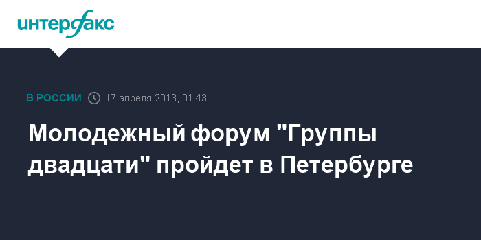 Санкт-Петербург. 17 апреля. ИНТЕРФАКС - Молодежный форум "Группы двадцати" откроется в среду в Петербурге, который в сентябре будет принимать саммит "Большой двадцатки" (G20).