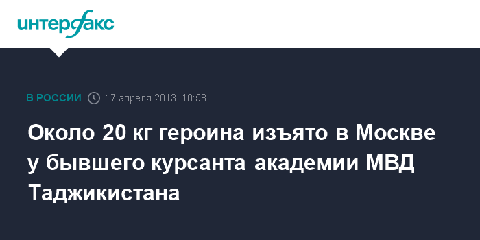 Москва. 17 апреля. INTERFAX.RU - Рекордная в этом году партия героина изъята в Москве у бывшего курсанта академии МВД Таджикистана, проживавшего в столице без регистрации.