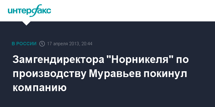 Москва. 17 апреля. INTERFAX.RU - Заместитель генерального директора "Норильского никеля" по производству Евгений Муравьев покинул компанию.
