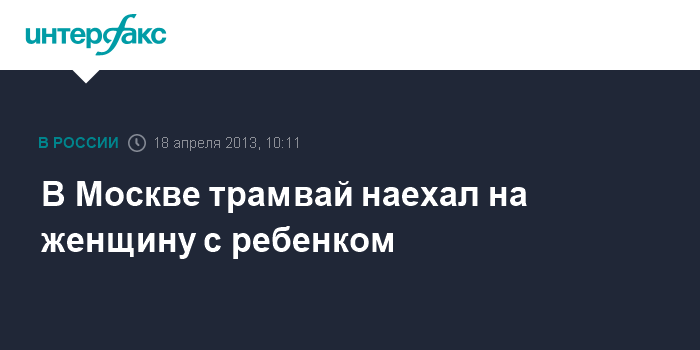 Москва. 18 апреля. INTERFAX.RU - Женщина с ребенком попали под трамвай на северо-западе Москвы, сообщил "Интерфаксу" источник в правоохранительных органах.