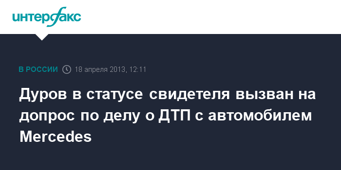 Санкт-Петербург. 18 апреля. INTERFAX.RU - Основатель социальной сети "ВКонтакте" Павел Дуров и вице-президент компании Илья Перекопский вызваны к следователю в статусе свидетелей по делу о ДТП с белым автомобилем Mercedes.