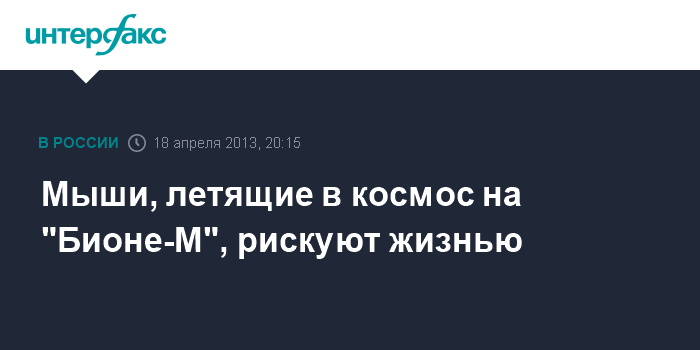 Байконур. 18 апреля. INTERFAX.RU - Мыши, которые отправятся в пятницу в месячный полет на орбиту Земли на научном аппарате "Бион-М", могут погибнуть в ходе полета, не исключают ученые Института медико-биологических проблем (ИМБП) РАН.