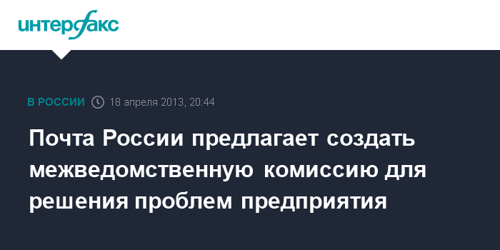 Москва. 18 апреля. INTERFAX.RU - ФГУП "Почта России" внесет в правительство предложения о создании межведомственной комиссии (МВК) по решению текущих проблем предприятия, сообщили в пресс-службе "Почты" со ссылкой на гендиректора Александра Киселева.