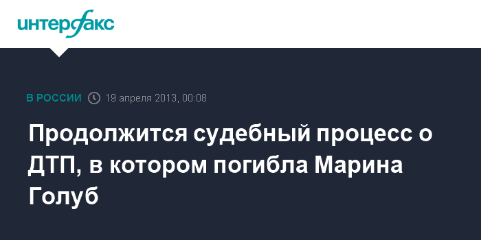 Москва. 19 апреля. INTERFAX.RU - Никулинский суд Москвы в пятницу продолжит рассмотрение по существу уголовного дела о гибели в автоаварии актрисы Марины Голуб.