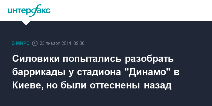 Киев. 23 января. INTERFAX.RU - Силовики попытались разобрать баррикады протестующих на ул. Грушевского возле входа на стадион им. Лобановского, сообщает 5-й канал в четверг ночью.