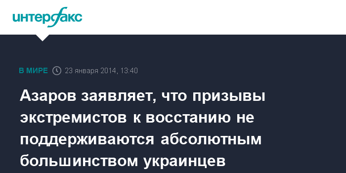 Давос. 23 января. INTERFAX.RU - Абсолютное большинство населения Украины не поддерживает призывов к восстанию, которые исходят от экстремистов, заявил премьер-министр Николай Азаров.
