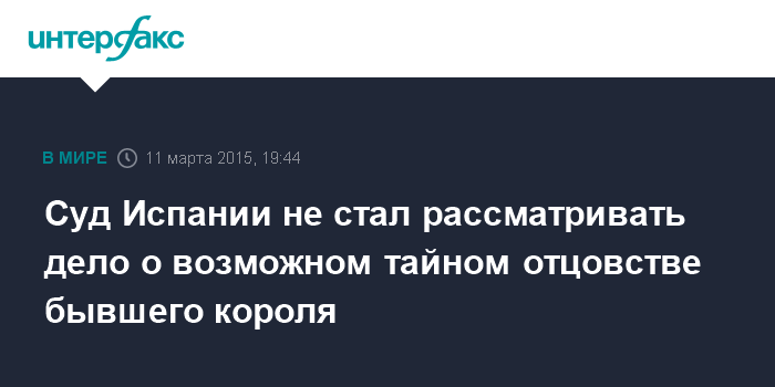 Москва. 11 марта. INTERFAX.RU - Верховный суд Испании отклонил иск об установлении отцовства, который подала подданная Бельгии Ингрид Сартье против отрекшегося от престола короля Испании Хуана Карлоса.