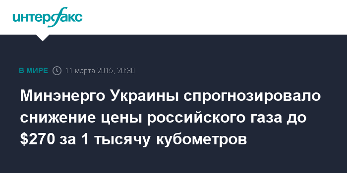 Москва. 11 марта. INTERFAX.RU - Украина ожидает, что цена российского природного газа для Украины снизится до $270 за 1 тыс. куб. м и ниже, сообщил министр энергетики и угольной промышленности Владимир Демчишин.