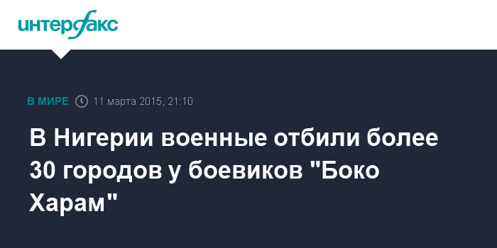 Москва. 11 марта. INTERFAX.RU - Боевики исламистской группировки "Боко Харам" выбиты из 36 городов с момента начала совместного наступления военных Нигерии, Чада, Камеруна и Нигера, сообщает в среду сайт ливанского издания Daily Star со ссылкой на представителя нигерийских служб безопасности.