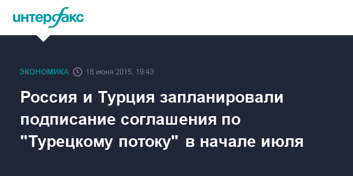 Москва. 18 июня. INTERFAX.RU - Россия и Турция могут подписать соглашение о строительстве первой нитки газопровода "Турецкий поток" в начале июля, сообщил глава Минэнерго Александр Новак в интервью телеканалу "Россия 24".