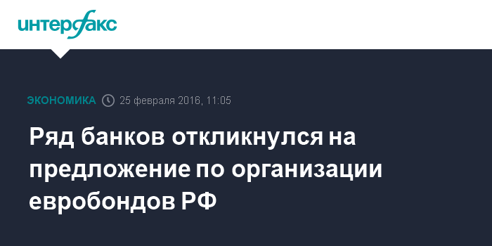 Москва. 25 февраля. INTERFAX.RU – Ряд банков откликнулся на предложение Минфина принять участие в размещении суверенных евробондов РФ.