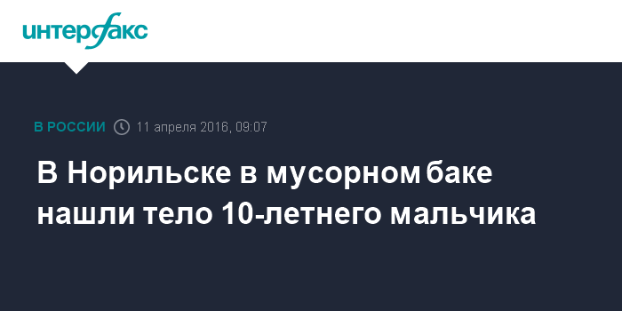 Москва. 11 апреля. INTERFAX.RU - Тело десятилетнего мальчика было обнаружено в понедельник утром в мусорном контейнере в Норильске, сообщает управление СКР по Красноярскому краю.