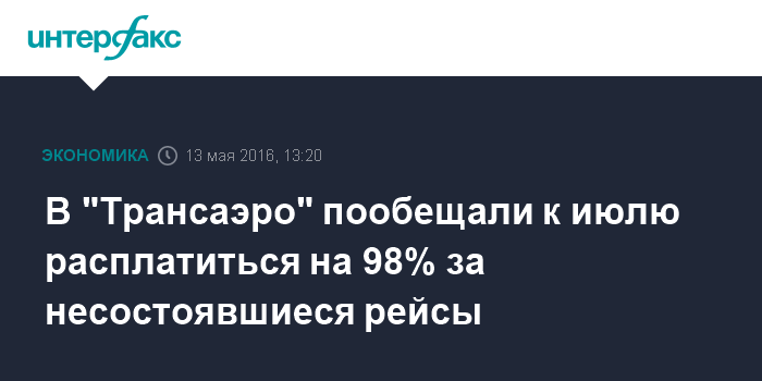 Москва. 13 мая. INTERFAX.RU - Авиакомпания "Трансаэро" к первому июля намерена закончить на 98% выплаты пассажирам за несостоявшиеся осенью 2015 года рейсы, сообщается на сайте перевозчика в пятницу.