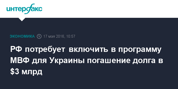 Москва. 17 мая. INTERFAX.RU - Россия будет требовать включить в программу Международного валютного фонда (МВФ) по выделению финансовой помощи Украине условие погашения долга на три миллиарда долларов перед РФ, заявил министр финансов РФ Антон Силуанов.