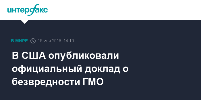 Москва. 18 мая. INTERFAX.RU - Национальные академии наук, техники и медицины США подготовили подробный доклад, посвященный генетически модифицированным (ГМ) сельскохозяйственным культурам. Главной мыслью доклада стало то, что продукты из ГМ-культур не только не вредны, но могут быть полезны для человека, сообщает сайт N+1.