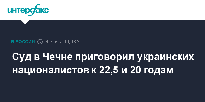 Москва. 26 мая. INTERFAX.RU - Верховный суд Чечни вынес приговор украинским националистам Николаю Карпюку и Станиславу Клыху, обвиненных в участии в 90-х годах в военных действиях в республике и убийстве российских военнослужащих, сообщили в четверг агентству "Интерфакс" в пресс-службе суда.