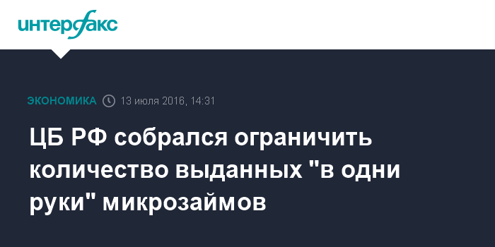 Москва. 13 июля. INTERFAX.RU - Банк России полагает, что ограничение на количество краткосрочных микрозаймов, выдаваемых "в одни руки", будет введено через базовые стандарты саморегулируемых организаций (СРО) микрофинансовых организаций (МФО) и кредитных кооперативов, сообщил советник Службы по защите прав потребителей финансовых услуг и миноритарных акционеров Банка России Алексей Чирков на конференции "Кредитный скоринг - 2016".