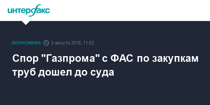 Речь идет о спорном тендере по закупке 213 тыс. тонн труб для газопровода "Сила Сибири", итоги которого должны были подвести не позднее пятого августа, а прием заявок планировался до 27 июля. При этом, как пишет "Коммерсант", производители труб надеялись, что спор "Газпрома" с ФАС не приведет к срыву поставок.