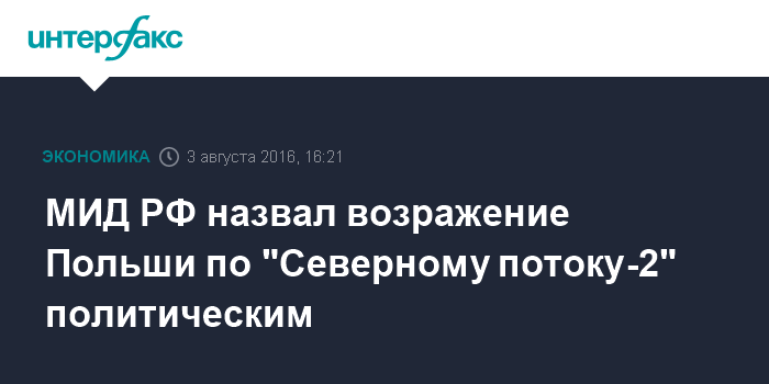 Москва. 3 августа. INTERFAX.RU - Политически мотивированным назвали в МИД РФ решение польского антимонопольного регулятора UOKiK, выпустившего возражение на заявку о формировании консорциума "Северный поток 2".