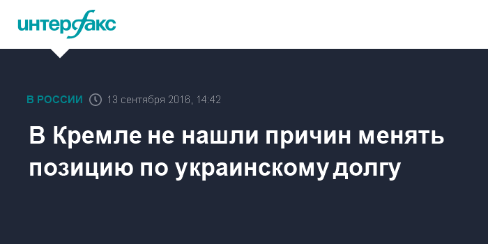 Москва. 13 сентября. INTERFAX.RU - Пресс-секретарь президента РФ Дмитрий Песков заявил, что позиция Москвы относительно долга Украины перед Россией в $3 млрд остается прежней.