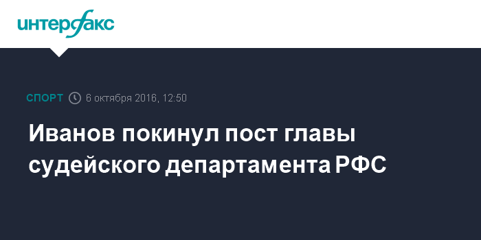 Москва. 6 октября. INTERFAX.RU - Глава судейского департамента Российского футбольного союза Валентин Иванов ушел со своего поста, сообщает пресс-служба РФС.