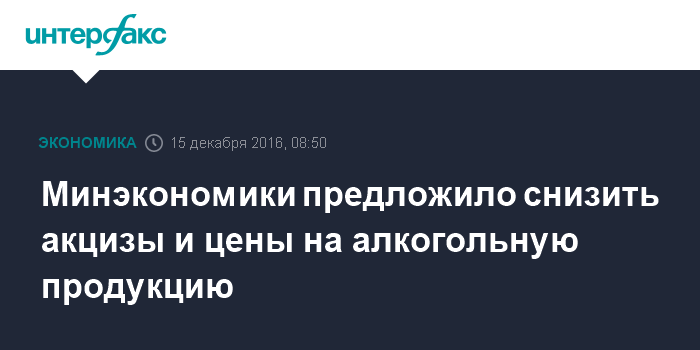 Москва. 15 декабря. INTERFAX.RU - Минэкономики предложило снизить ставки акцизов и минимальные розничные цены на алкогольную продукцию, а также снять ограничения на розничную продажу спиртного, введенные в 2012-2016 годах, пишет газета "Коммерсант".