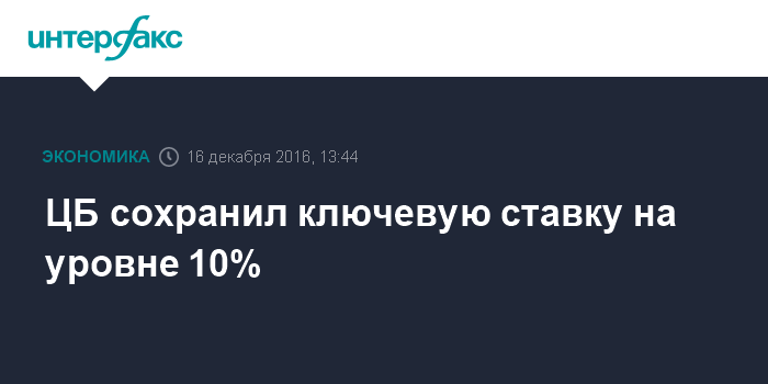 Москва. 16 декабря. INTERFAX.RU - Совет директоров Банка России 16 декабря принял решение сохранить ключевую ставку на уровне 10%. В последних двух заявлениях регулятор указывал на необходимость поддержания текущего уровня ключевой ставки до конца 2016 года, с возможностью ее снижения в I-II квартале 2017 года.