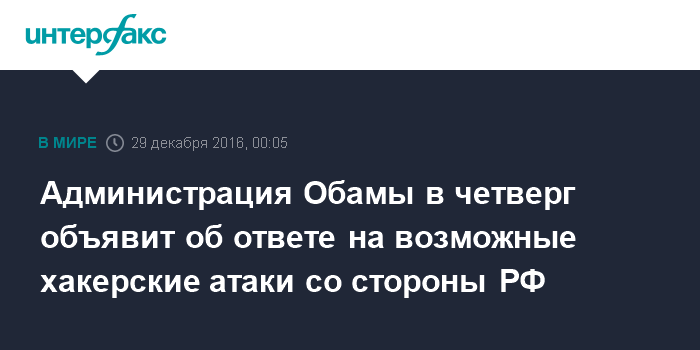 Москва. 29 декабря. INTERFAX.RU - Администрация президента США Барака Обамы собирается в четверг объявить об ответных мерах против РФ из-за возможной причастности России к хакерским атакам во время американской предвыборной кампании, сообщил CNN со ссылкой на информированные официальные лица.