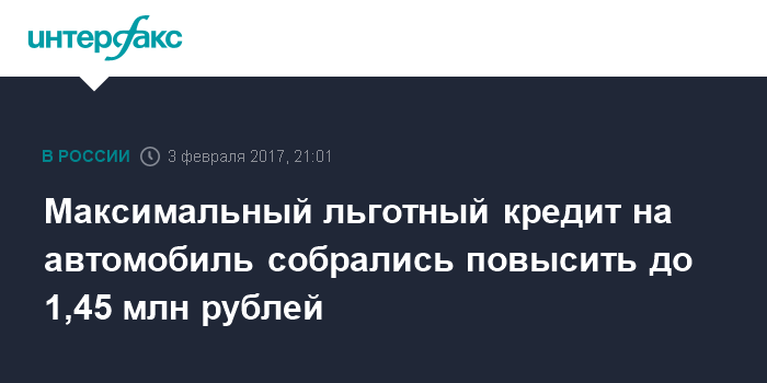 Москва. 3 февраля. INTERFAX.RU - Министерство промышленности и торговли РФ планирует повысить планку максимальной стоимости автомобиля для участия в программе льготного автокредитования до 1,45 млн руб., говорится в проекте постановления правительства.