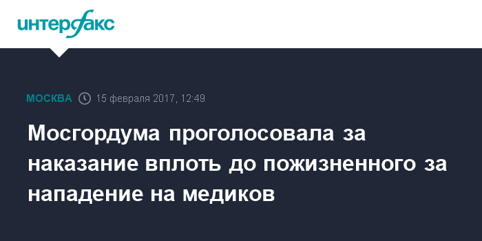 Москва. 15 февраля. INTERFAX.RU - Законодательная инициатива проекта федерального закона, предусматривающая наказание вплоть до пожизненного заключения за применения насилия в отношении медработников при исполнении обязанностей, принята на заседании профильных комиссий Мосгордумы в среду.