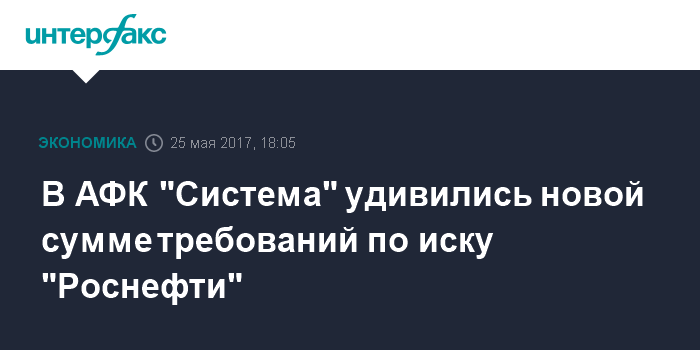 Москва. 25 мая. INTERFAX.RU - Новая сумма требований в рамках иска "Роснефти" и "Башнефти" к АФК "Система" (увеличена со 106,6 до 170,62 млрд рублей) не имеет под собой "ни правовой, ни экономической основы", заявил холдинг Владимира Евтушенкова.