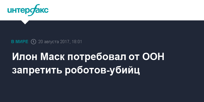 Москва. 20 августа. INTERFAX.RU - Группа из 116 специалистов, представляющих 26 стран мира, обратилась к Организации международных наций с призывом запретить разработку и использование автономного оружия. Как уточняет The Guardian, в числе авторов обращения гендиректор SpaceX Илон Маск и основатель компании, занимающейся искусственным интеллектом, DeepMind Мустафа Сулейман.